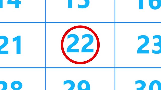 Calendar of april month 22nd day is red circled,looped animation.A very important date in the calendar.Signing a day on a calendar.