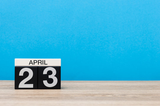 April 23rd. Day 23 of month, calendar on wooden table and blue background. Spring time, empty space for text