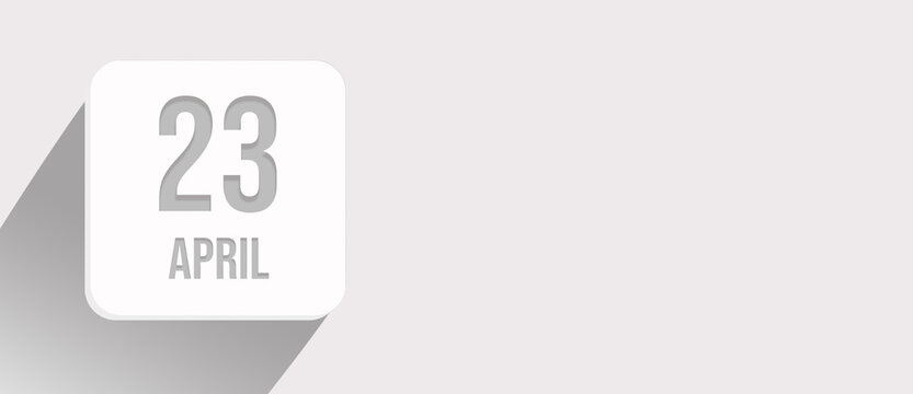 April 23rd. Day 23 of month, Calendar date. Calendar leaf icon on white with sunlight and long shadow, flat design.  Spring month, day of the year concept.