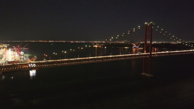 Aerial drone shot by iconic and famous 25th April Bridge, Ponte 25 de Abril, and Cristo Rei in Lisbon, Portugal, Europe. Night, waterfront, drone panning slowly