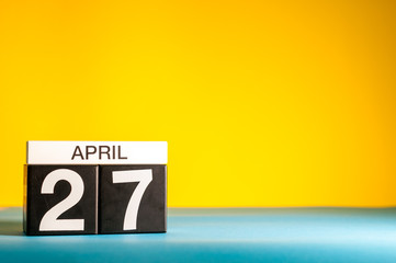 Calendar. April 27th. Wood cube calendar with date of month and day. Newborn postcard concept for girls with copy space. Birthday concept. Greeting or invitation card.