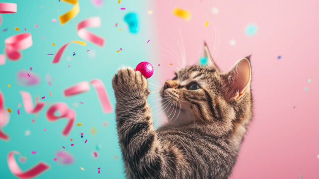 Playful Cat Paw Reaching Confetti and Ball on Colorful Background. Concept of Pet Fun, Playful Animals, Joyful Celebrations, Festive Atmosphere. April Fools' Day
