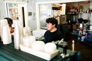 A handsome male barista in a black apron at the counter of a modern coffee shop with a smile on his face