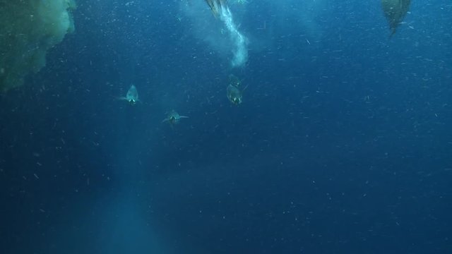 Emperor penguins (Aptenodytes forsteri) swimming under sea ice and past camera with bubbles, underwater, Cape Washington, Antarctica