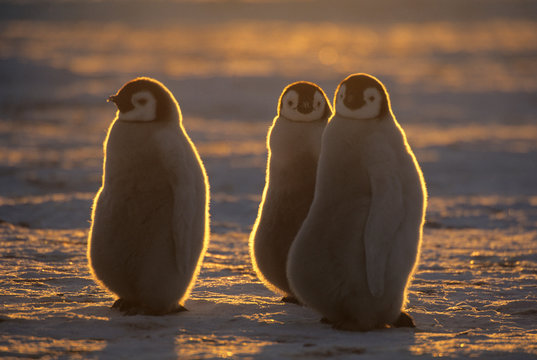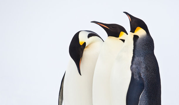 Snow Hill, Antarctica. Three Emperor Penguins. High Key.