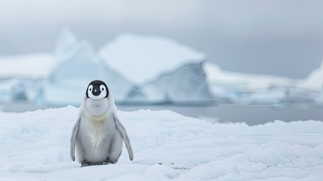 A captivating glimpse of an Emperor penguin chick exploring the pristine snowy landscape of Snow Hill Island in the Weddell Sea, Antarctica.