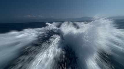 Dynamic perspective from a fast-moving boat, showcasing the powerful white wake churning across the vibrant blue ocean under a clear, open sky, evoking speed and adventure on the open water
