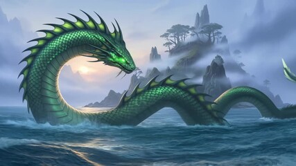 Green sea dragon emerges from ocean, an epic sea monster adventure with mythology and creature fantasy