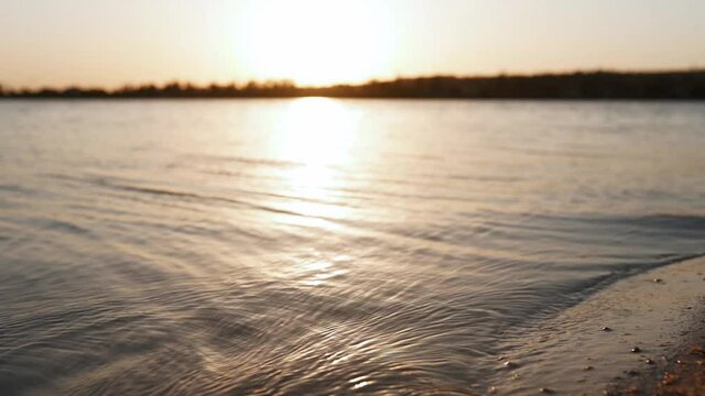 Nature background of lake calm water surface with ripples on sunset sunlight. Sea, ocean, river, bay or pond waves in sunny weather on sunrise. Reflection of low sun in water. Low angle. Slow motion.