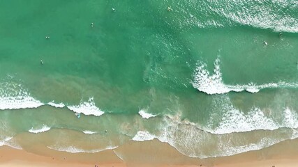 Top view beach with waves crashing on sandy shore