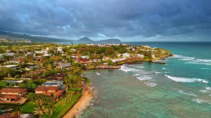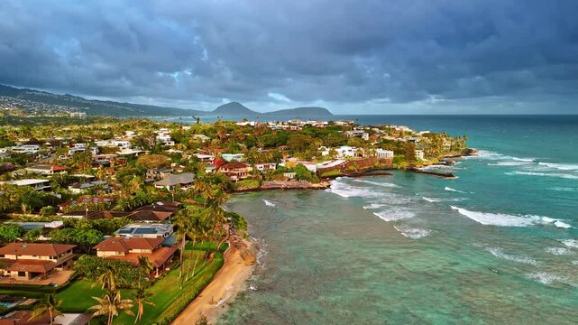 Beautiful villas in the stunning lush greenery on the picturesque shore of Hawaii, USA. Waves roll to the sandy beach. Heavy cloudscape covering the sky above the panorama. Aerial perspective.