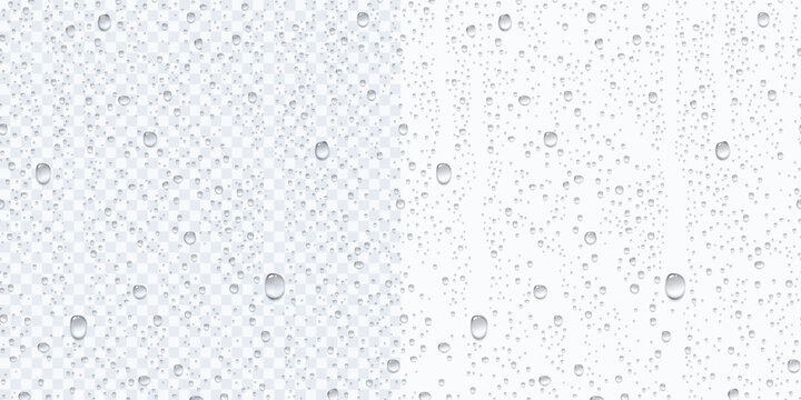 Realistic transparent water droplets, drops, water-drop on wet clear window surface with crystal clarity, fresh liquid texture, bubbles and moisture reflection on clear glass surface for design