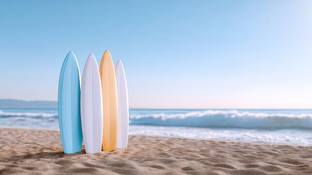 Colorful Surfboards Standing on Sandy Beach Under Clear Blue Sky with Gentle Waves in Background on a Bright Sunny Day