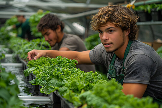 Teen European men practicing aqua ponics a high tech greenhouse in Amsterdam Netherlands integrating fish farming with vegetable cultivation