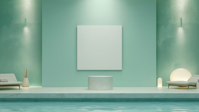 Minimal decor in luxury spa lobby with tranquil aqua wall and podium.