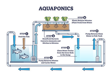 Aquaponics food production with hydroponics plants and fishes outline diagram. Environmental and nature friendly gardening and agriculture model with ecological irrigation system vector illustration.