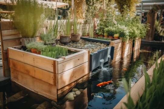 outdoor aquaponics garden with beautiful plants and fish swimming in water, created with generative ai