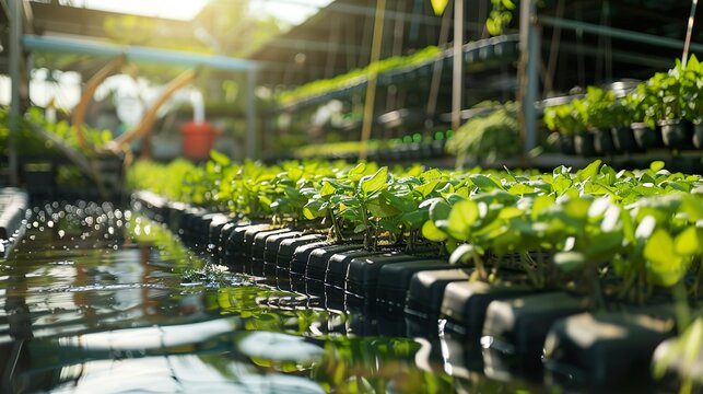 Sustainable aquaponics combining fish farming and plant cultivation.