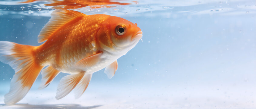 Vibrant orange goldfish swimming in clear blue water. Close up of a pet fish in an aquarium tank. Underwater background with copy space for text