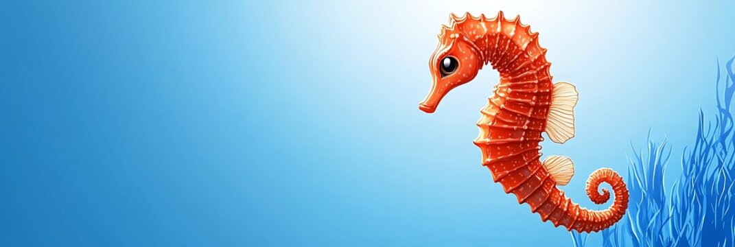 Sea Horse floating near Seaweed in Ocean. Backdrop of Sky Blue sea, for Print