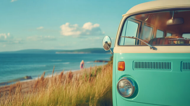 A vintage turquoise van parked near the beach, framed by golden grass, with a serene ocean backdrop and a bright blue sky dotted with clouds.