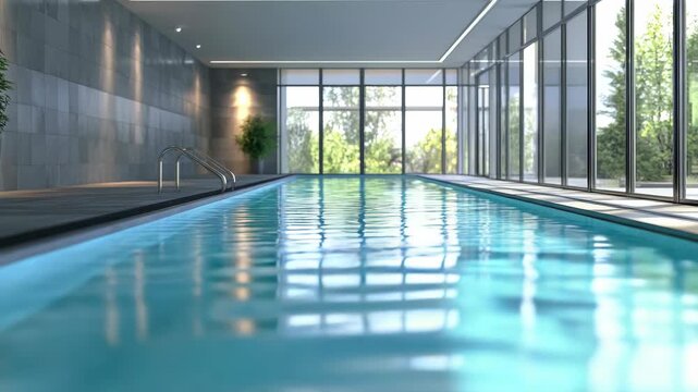 Sunlight streams into a modern indoor swimming pool with lanes and starting blocks, creating a serene atmosphere