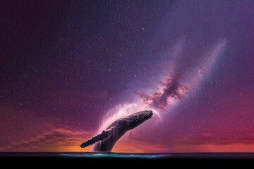 blue whale jumping from the sea with starry sky, generative ai