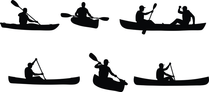 Canoe kayak silhouettes, paddling poses, black vector clipart, water sports icons, outdoor activity, adventure design, recreation illustration, motion graphics
