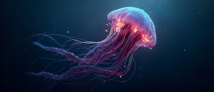 Bioluminescent jellyfish swimming gracefully in the deep dark blue ocean depths