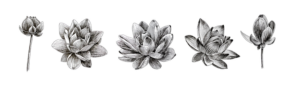 Tranquil lotus pond with delicate blossoms floating on the surface. Vector flat minimalistic isolated illustration.
