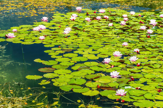 Beautiful pink lotus or water lily flowers blooming on pond