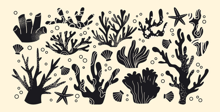 Silhouettes corals and seaweed, underwater ocean flora. Cartoon marine plants of the seabed. Vintage botanical elements in retro groovy style
