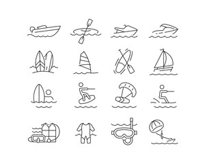 Beach Watersports Icon collection containing 16 editable stroke icons. Perfect for logos, stats and infographics. Edit the thickness of the line in Adobe Illustrator (or any vector capable app).