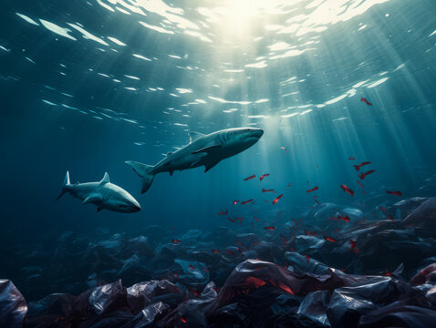 Whale made of plastic bags are swiming in the ocean. Contamination of the Oceans. Marine plastic pollution concept. Environmental pollution. Ai generative