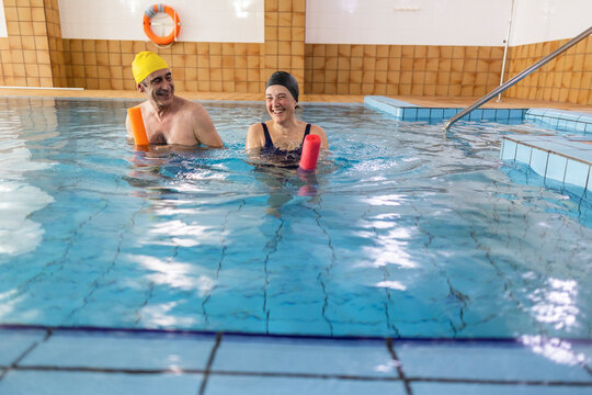 Smiling couple enjoying aquatic exercise together in indoor swimming pool