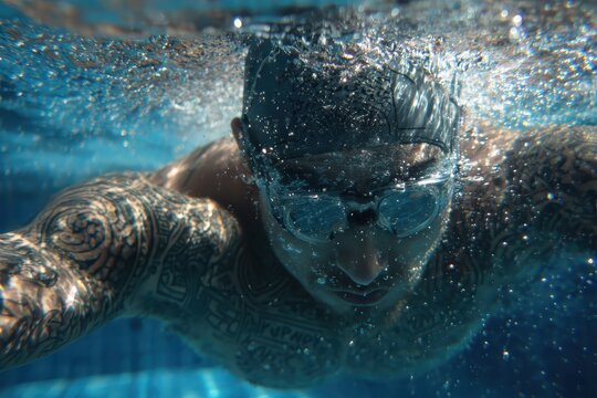Swimmer practicing in indoor pool competitive training aquatic environment close-up perspective focus on performance