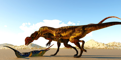 Dilophosaurus Dinosaurs find Eurohinosaurus - A Eurohinosaurus marine reptile lays helpless on the tidal flats as the sea goes out as two Dilophosaurus theropod dinosaurs look at him as their next mea