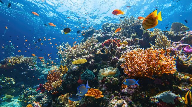 colorful, healthy coral reef with various fish species and marine life, offering a peek into the thriving underwater ecosystem.