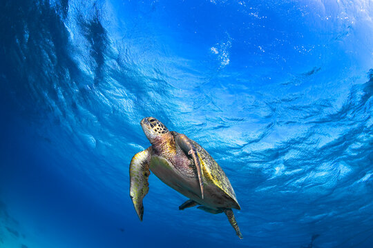 A green sea turtle glides gracefully over a coral reef in the clear waters of Lady Elliot Island, Queensland, Australia.