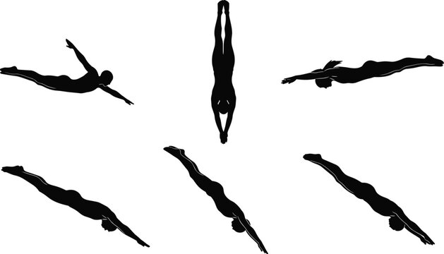 Diver silhouette, diving positions, aquatic sport, swimmer vector, water sports graphic, human figure clipart, competitive diving art, underwater sport illustration, athlete motion design