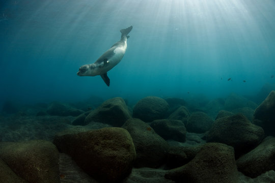 Dolphin swimming underwater, sunbeams. Concept of marine life, ocean wildlife, and aquatic animals.