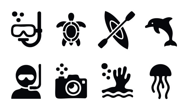 Collection of eight black and white aquatic sport and marine life icons for use in travel and adventure promotions.