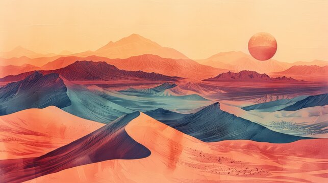 Aquatint Desert Dawn: A Panoramic Landscape of Warm Hues and Layered Mountains