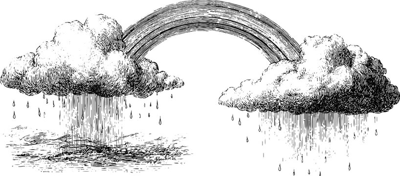 Engraved vintage rainbow over meadow scene with rain clouds