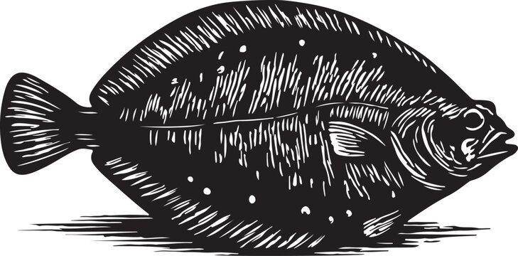 Detailed black and white woodcut illustration of a flatfish with distinctive spots on its body and fins