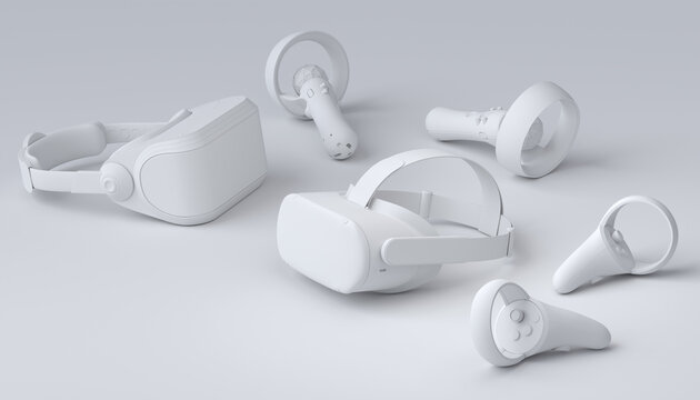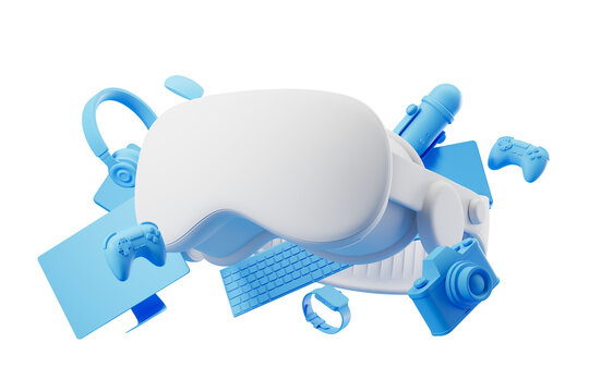 VR headset with gaming accessories, including controllers and headphones, isolated on white background. Concept of virtual reality. 3D Rendering