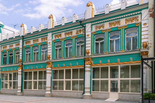 The building of the art museum in the city of Vladikavkaz. An old mansion of the early 20th century in the art nouveau style with eclectic elements. Gilded stucco on the old building.