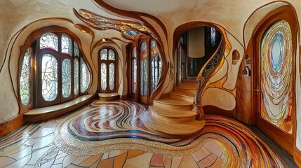Art Nouveau inspired foyer with organic shapes and stained glass