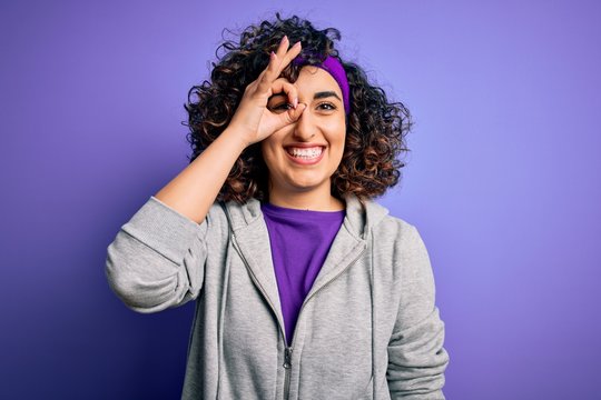 Beautiful curly arab sportswoman doing sport wearing sportswear over purple background doing ok gesture with hand smiling, eye looking through fingers with happy face.