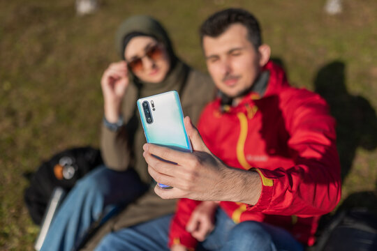 Happy Muslim student in pink hijab with blue backpack standing in spring garden. Natural lighting, outdoor campus lifestyle. Education concept.